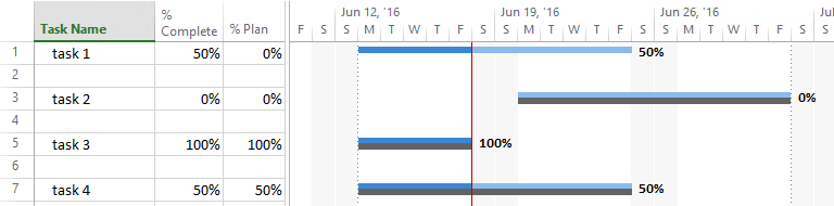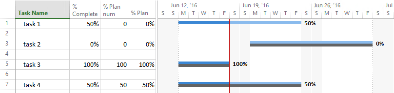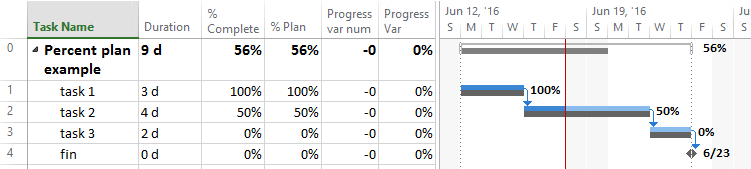 In this example, we get a % Plan that is not consistent with the % Complete. You can see that because, even when the tasks has actual progress according to the plan, the project summary task has a variation of 6%.